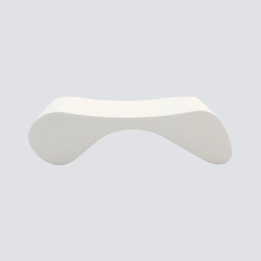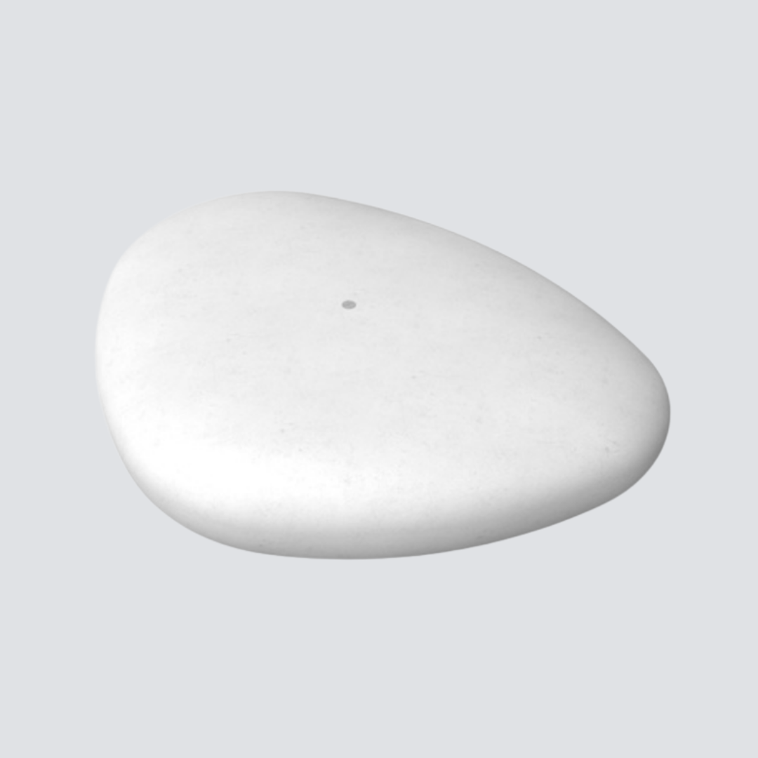 Banco em formato escultural que remete a pedra seixo, construído em concreto branco armado com estrutura interna de aço. Sem encosto, possui pés integrados e buchas metálicas para movimentação. Acabamento polido e tratamento que realça estética e durabilidade.
