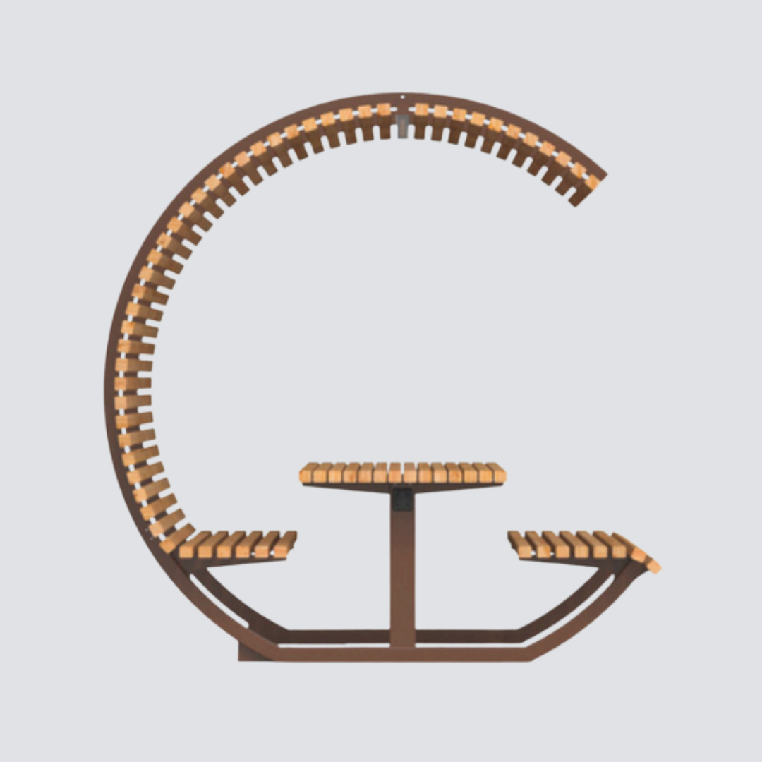 Conjunto integrado de mesa e bancos sem encosto, ideal para ambientes externos ou coletivos. Estrutura metálica reforçada e tampos em madeira maciça de reflorestamento com acabamento resistente às intempéries, fungos, maresia e ação solar.