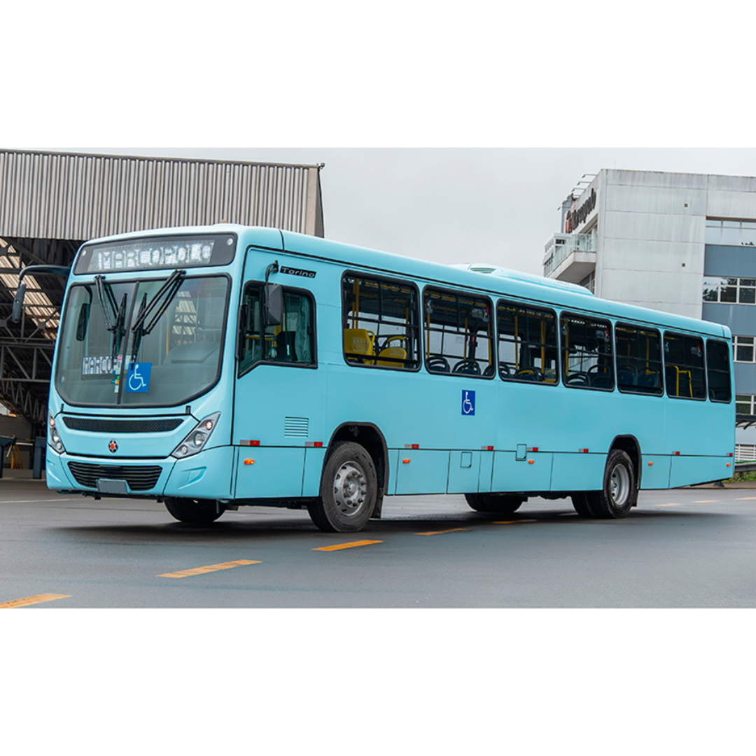 Ônibus urbano novo, zero quilômetro, de fabricação nacional, ano/modelo 2025/2025 ou do exercício em curso, com motor dianteiro e carroceria Marcopolo – Modelo Torino. Projetado para transporte coletivo municipal, alia conforto, acessibilidade, segurança e tecnologia, atendendo aos requisitos para contratação por Ata de Registro de Preços (ARP).