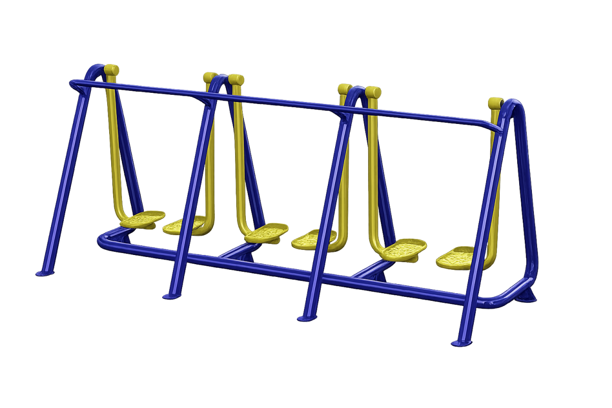 Simulador de Caminhada Triplo galvanizado a fogo, desenvolvido para uso simultâneo de até 03 usuários. Equipamento destinado ao aumento da mobilidade dos membros inferiores e ao desenvolvimento da coordenação motora. Indicado para academias ao ar livre, praças, parques e espaços públicos, com estrutura reforçada, resistente às intempéries e fixação segura ao solo.