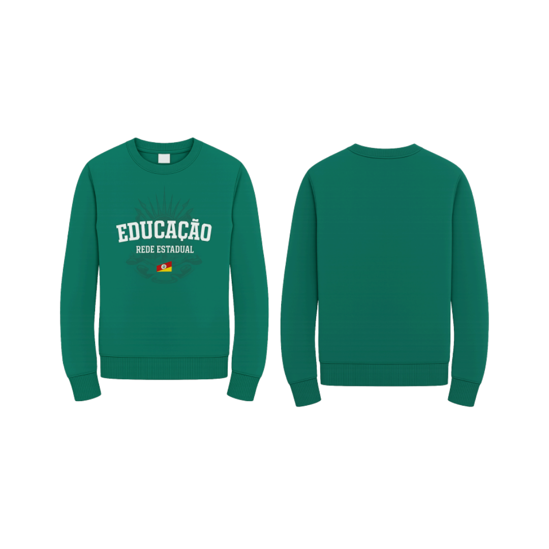 Blusão escolar unissex confeccionado em moletom, com composição de 75% algodão e 25% poliéster, gramatura de 300 g/m², gola redonda em ribana canelada e aplicação de logotipo em serigrafia com tinta à base d’água. Indicado para uso escolar em dias frios, com acabamento reforçado na gola e modelagem confortável para crianças, adolescentes e adultos.