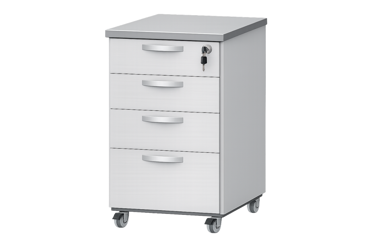 Gaveteiro volante para escritório confeccionado em MDP BP de alta densidade, com quatro gavetas funcionais, sistema de travamento independente e rodízios para fácil mobilidade. Ideal para organização de documentos em ambientes corporativos, oferecendo resistência, segurança e praticidade no uso diário.