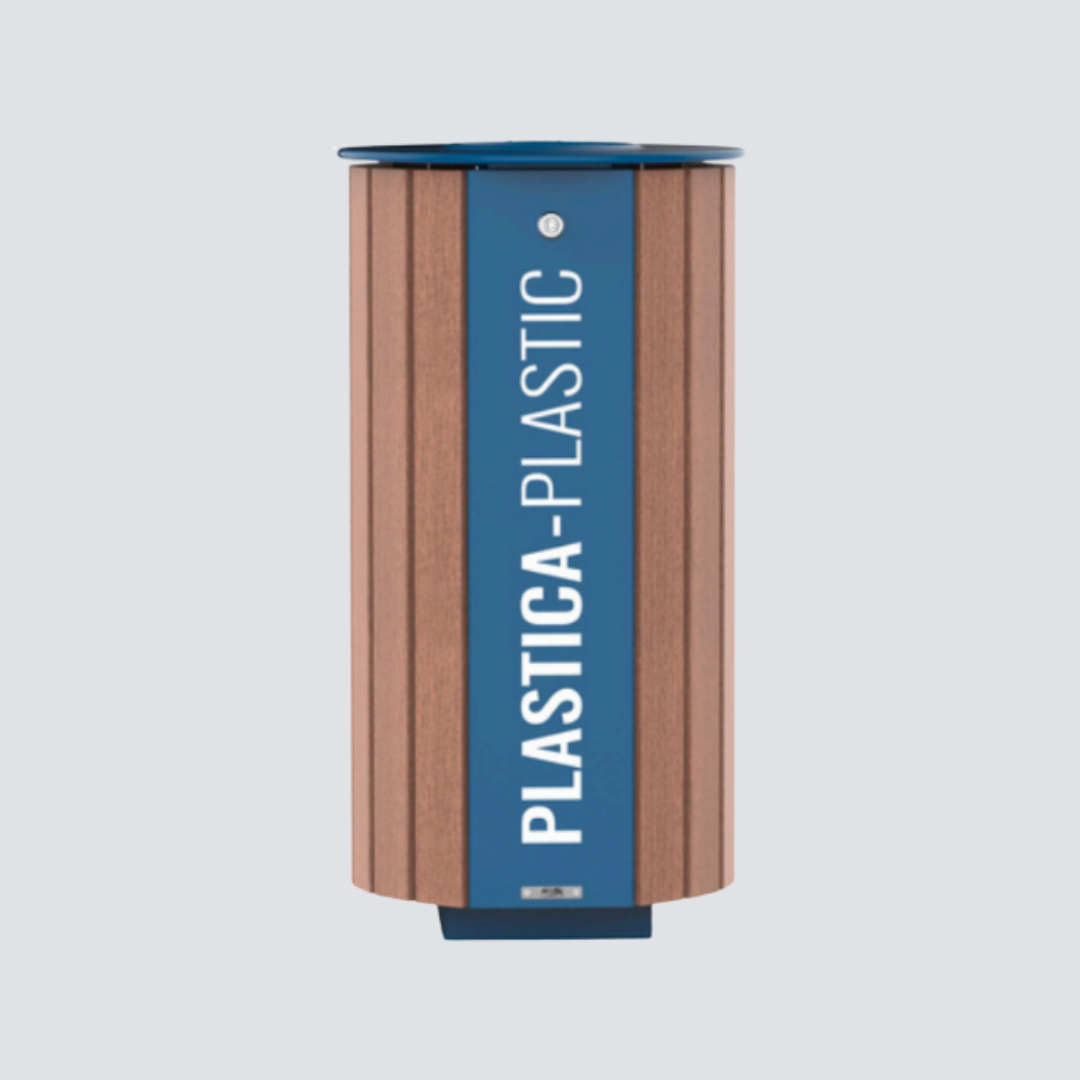 Lixeira circular com estrutura metálica revestida com listões de madeira maciça de reflorestamento. Design sofisticado, tampa articulada com trava e aro interno para fixação de saco de lixo. Ideal para áreas urbanas, parques e espaços externos com estética diferenciada.