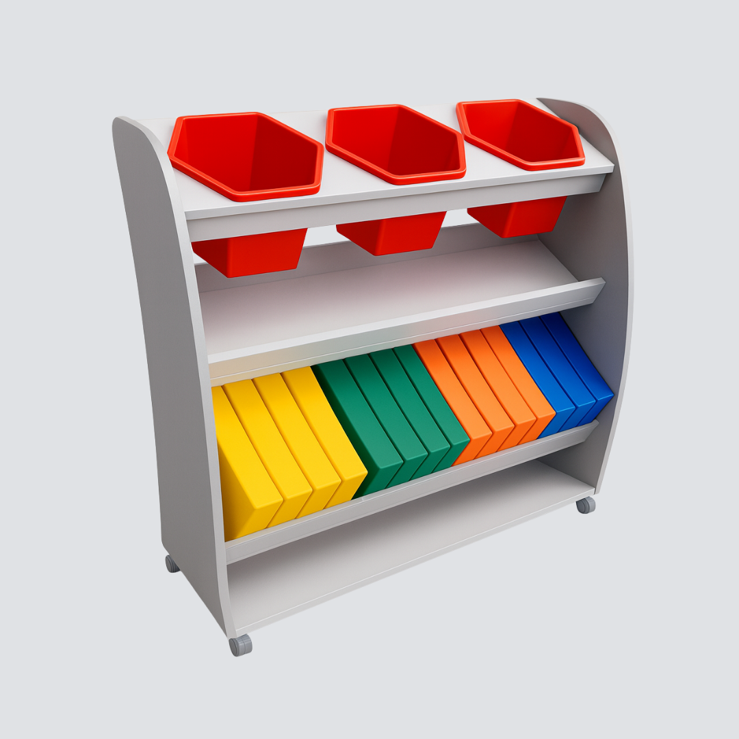 Estrutura resistente, leve e segura, ideal para armazenamento de brinquedos, livros e materiais pedagógicos.